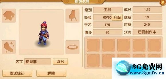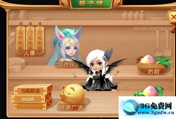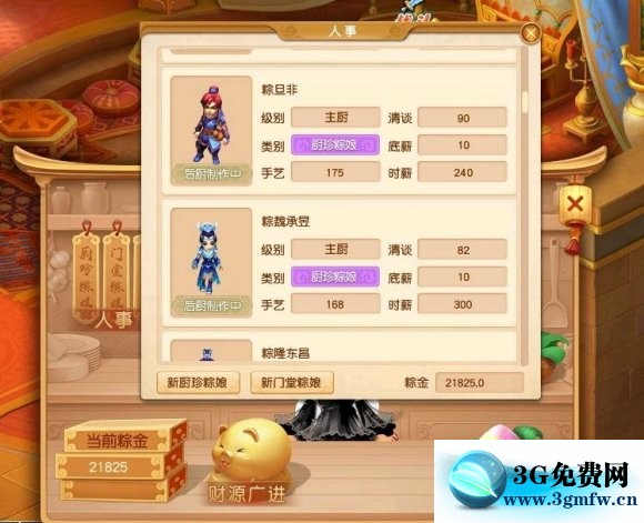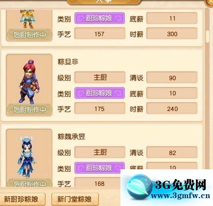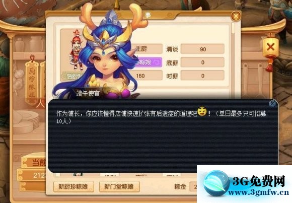 刚开始的阶段是很困难的,因为初始资金少,所以要谨慎一点,先雇两个厨珍粽娘,门堂粽娘到结束都不需要,后面细说