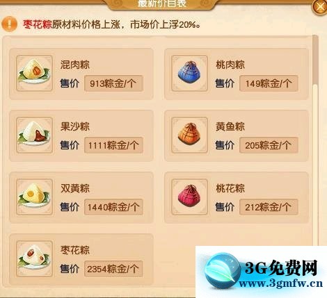 刚开始的时候,挑刷价高的做,每天9点到晚上11点,每个整点会出现一个溢价收的粽子,所以,哪个价格高,刷哪一个,现在枣花粽是最合适的