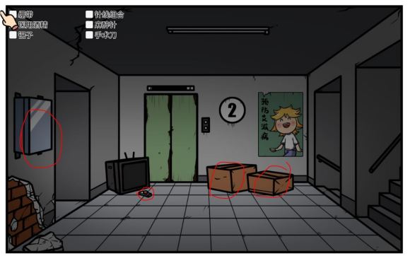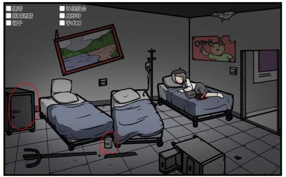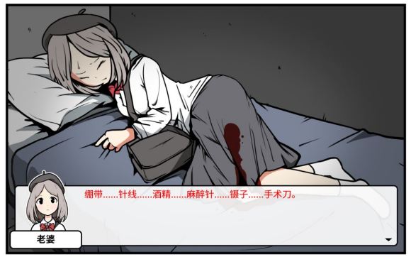 老婆的腿受伤了,把老婆背到附近的一家废弃医院进行检查,发现老婆大腿中枪,需要进行手术。所需材料为绷带、针线、酒精、麻醉针、镊子、手术刀,需要找齐这些物品