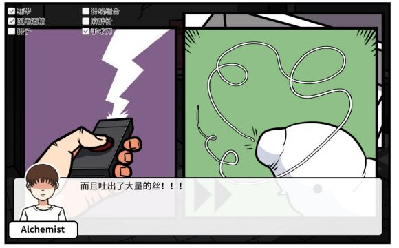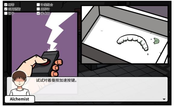 检查右侧的小盒,喂蚕宝宝桑叶,然后对蚕使用加速器,蚕立刻吐丝,得到线