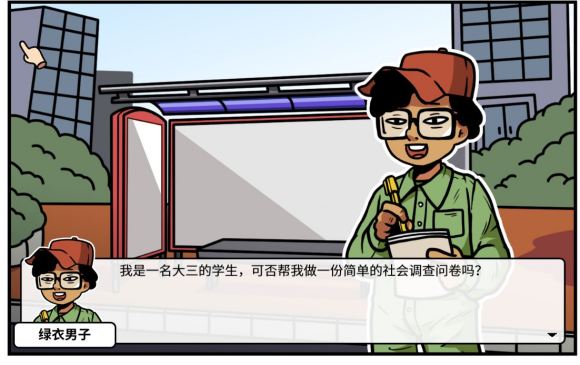 如果选择坐公车,会遇到一个做社会调查的绿衣男子对你进行一系列的调查,但所有选择的结果都与剧情无关