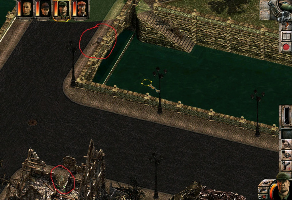 间谍跟着巡逻队爬到水池这边,监视露台上的正对水池的步兵的视线,等露台上那个走动的步兵往回走的时候,间谍爬到红线半圆里的位置时,就可以站立起来,向着德军军服跑步前进了!上楼梯后,迅速拿到军服并穿上!