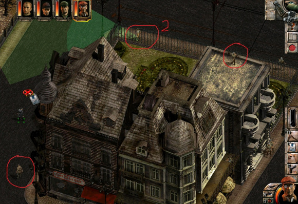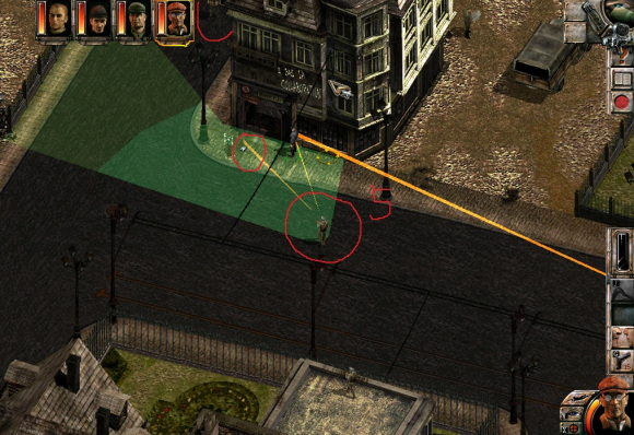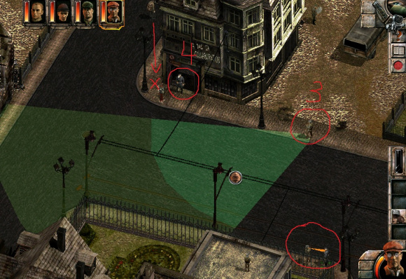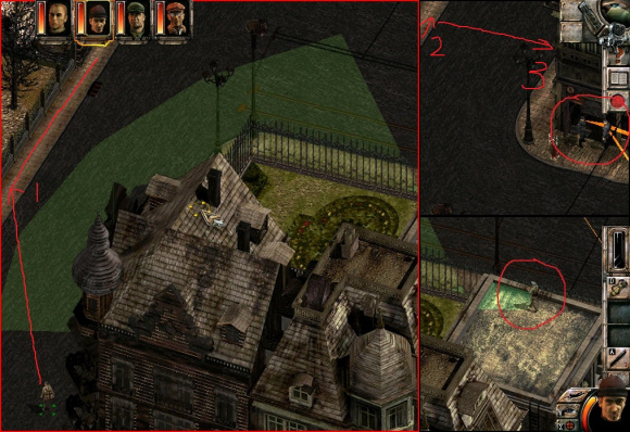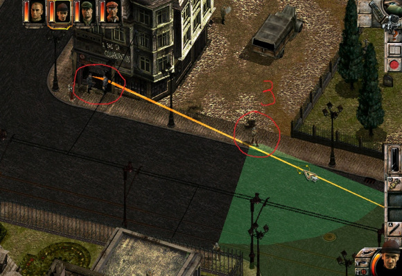 (5)间谍扔香烟到图中位置,把步兵1吸引到楼顶步兵的视线盲点,水手飞刀干掉他