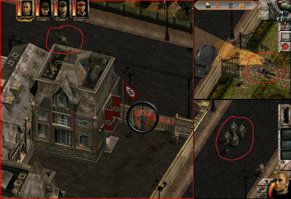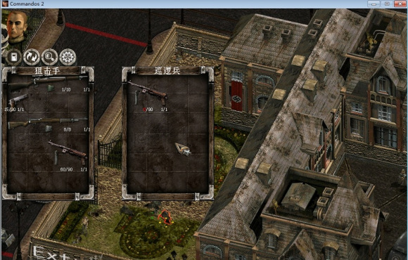 然后,3人如图位置,左边是狙击手,冲锋枪自动射击模式(冲锋枪需要射击范围大角度,和步枪略有不同),下面是间谍,手枪开枪吸引巡逻兵,右侧是水手,准备搬尸体给狙击手补充弹药。