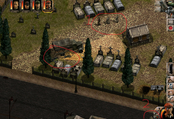 狙击手,水手,间谍都趴着埋伏在这里,狙击手和水手步枪满弹药8发,自动射击模式,准备伏击墓地里的3个巡逻兵组1号,间谍用手枪开枪吸引他们过来。