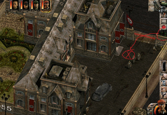 此时需要测试一下,按F键步枪,看看是否能打到炸弹,能打到炸弹就可以了,之后就趁巡逻队再次回头的时候,开枪射击炸弹,同时炸掉司令部和3人组巡逻队。炸掉后,间谍要速度躲到墙角,以免被对方盖世太保军官发现。