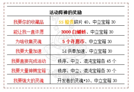 活动期间众神关注度达到100后,概率会出现活动降神,期间共会出现3次,可向其许愿获得奖励,愿望与奖励如表所示,其中3000蝌蚪和5许愿币两个愿望账号限获得一次。