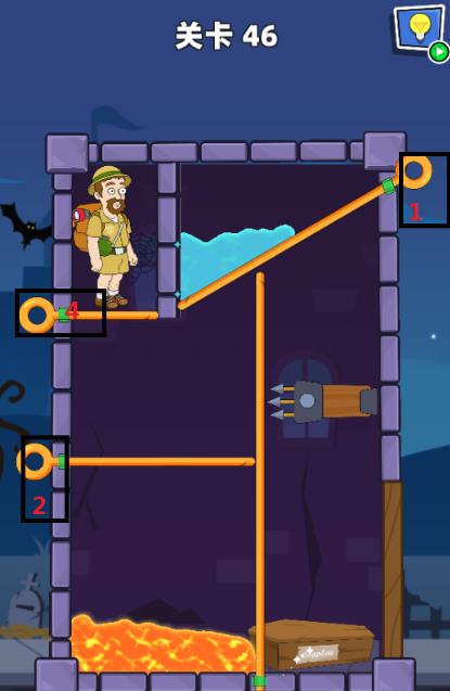 救救小老弟第46关怎么过? 救救小老弟攻略第46关 1.点击右上方的杆子。 2.点击左边下面的杆子让水和熔浆到一起。 3.点击中间下面的杆子。 4.点击左上角的杆子。 老友网www.andlaou.com免费为你分享