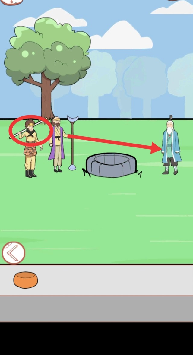 第一场景拿行李中的钵(饭盆),去第二场景,拿金箍棒打晕道士,得到无根水瓶(假的,是河水),让沙和尚用钵打井水(真无根水),把瓶子给女王,女王离开,给唐唐喝井水,点路过关