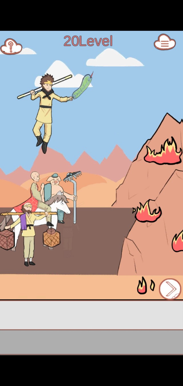 取经是不可能被阻止的第20关怎么过? 取经是不可能被阻止的攻略第20关 先打第二场景,拿到牛魔王画像,给猴哥看,变身后,触发见面剧情,得到芭蕉扇,扇走大火,点路过关 老友网www.andlaou.com免费为你分享