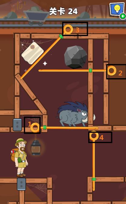 救救小老弟第24关怎么过? 救救小老弟攻略第24关 1.点击最靠近冒险家的杆子。 2.点击右上方石头下面的杆子砸死野猪。 3.点击左上方的杆子。 4.点击右下方的杆子。 老友网www.andlaou.com免费为你分享