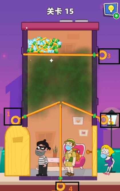 救救小老弟第15关怎么过? 救救小老弟攻略第15关 1.点进左边唯一的杆子将强盗毒倒。 2.点击右下方的杆子。 3.点击右上方的杆子。 4.点击冒险家前面的杆子。 老友网www.andlaou.com免费为你分享