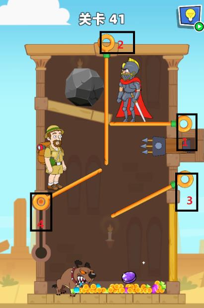 救救小老弟第41关怎么过? 救救小老弟攻略第41关 1.点击右边最上面的杆子消灭骑士破坏机关。 2.点击最上面中间的杆子消灭狗子。 3.点击右边下面的杆子。 4.点击左边的杆子。 老友网www.andlaou.com免费为你分享