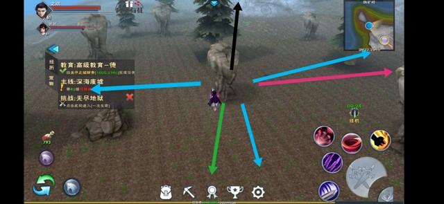 3.点挂机,再取消(1s),看人物前往的方向,骑宠沿着方向冲冲冲,顺着方向不要太远超出资源区,一般而言会有所收获。