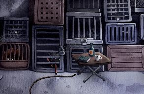 1.点击新游戏,小男孩在铁笼里醒来,点击放大镜开始调查