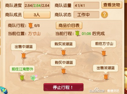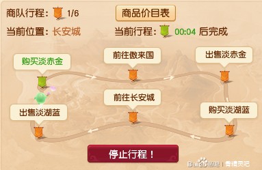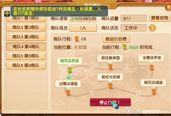 你必须在商队到达傲来国或者长安城时然后卖掉了身上的东西,比如到达了长安城,出售淡湖蓝完成,在购买淡赤金前停止他的行程,让他的商队运量保证是0/上限,商队在前往长安城的行程中是有几分钟的时间的,但出售淡湖蓝的过程只有5秒,购买淡赤金的过程也只有5秒,所以把握住他卖完和买之前的这个时间段,停止他的行程,这样就回到了起点。不然你给他改路线但他之前的货还没卖掉呢,带着旧货去做新的生意,旧货会占地方。