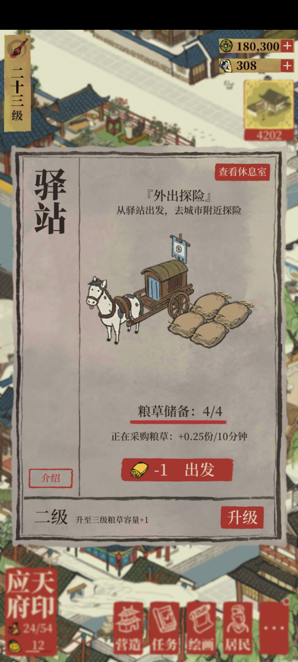 前期需要修复的建筑有两个,客栈和驿站,客栈可以暂缓修复,因为客栈的作用是利用资源换取铜币和金画轴,前期资源紧缺跟着任务慢慢来就行。驿站的作用是解锁主线剧情,需要尽早开启。