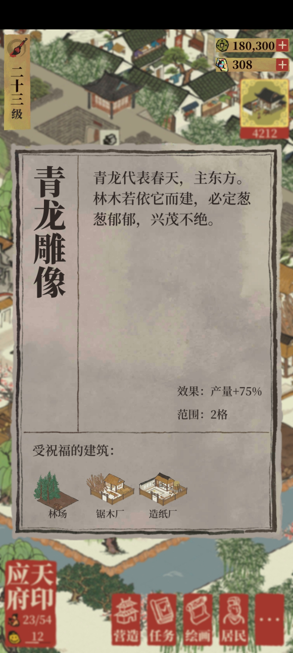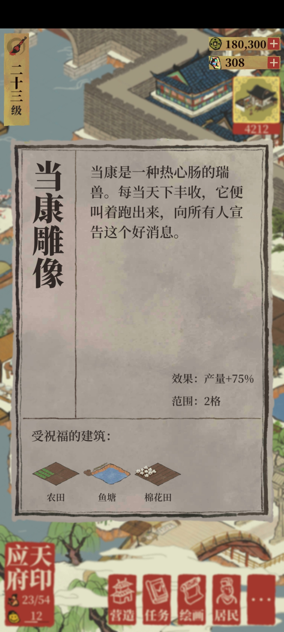 游戏进行到一定程度的玩家,会发现神像这个东西,可以给周围的指定建筑提供高额Buff.所以在游戏前期是要优先解锁神像的,除了系统任务解锁的灶王爷外,优先解锁城外的两个资源雕像,能够为玩家提供高额的资源加成。然后再解锁地图右侧的织女像,为下一步的纺织产业提供加成。