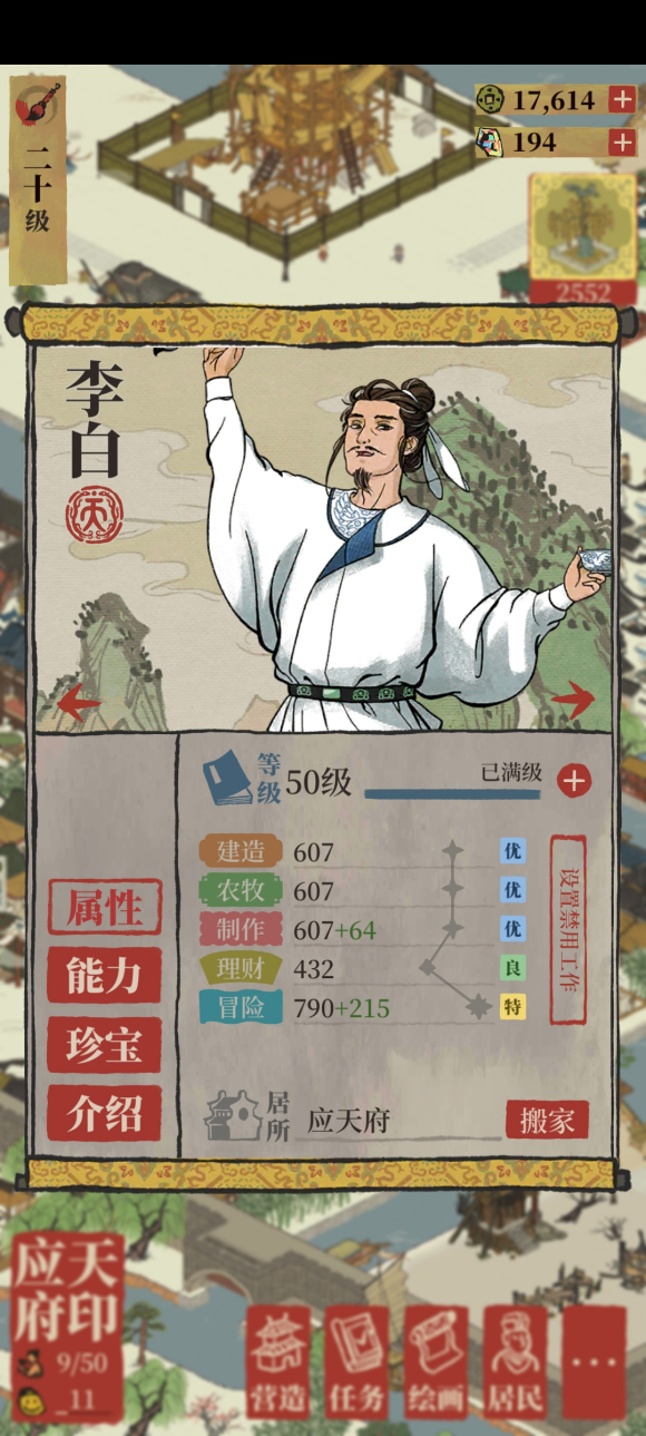 李白,探险之神,任何资源收集体力消耗减少8,最低1点。