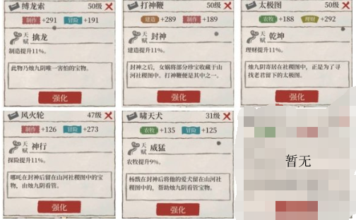 珍宝可通过强化升级,满级50级。珍宝在10/20/30/40级时需要突破才能继续升级,需消耗一个相同珍宝以及大量铜币(天级2万、侯级3千)才能突破。