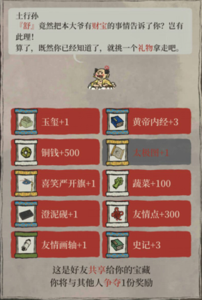 天级珍宝>30补天石=金画轴>喜笑颜开旗>10补天石=3金矿>5000铜币>300友情点>书籍=侯级珍宝>其它