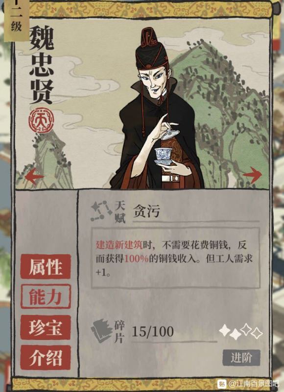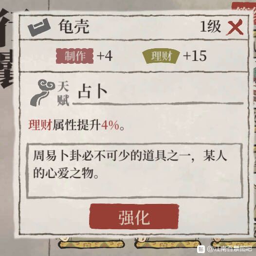 看这帖子好像人气还挺高 那再给大家分享一下天级珍宝吧 一共是8个 其中龟壳 桃花 凤凰是有特殊效果的 但是这个特殊效果是有前提的 龟壳-沈周 桃花-唐伯虎 凤凰-武则天 特殊效果就是在角色原有天赋基础上有个小增益 如果佩戴在其他人身上是没有这个小增益的