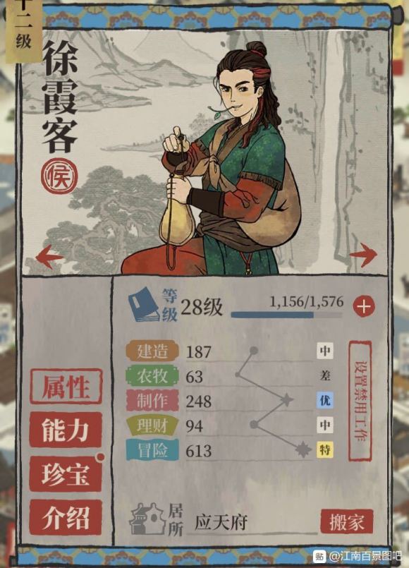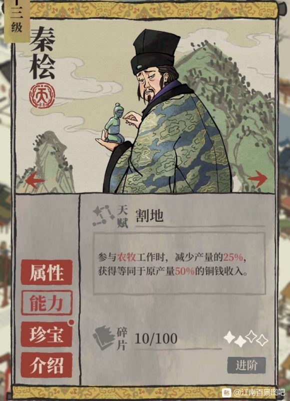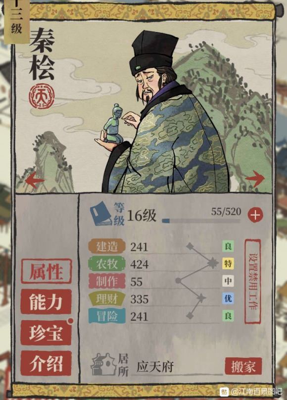 有吧友问秦桧 那咱们讲讲这个老头 虽然他的能力有减少产品的25% 但是他农牧属性高啊 一加一减直接抵消 就相当于产品无加成但是50%的钱拿 而且我这个没升过级 升级之后农牧属性变高了估计种地就有加成了