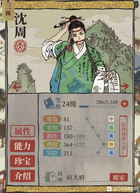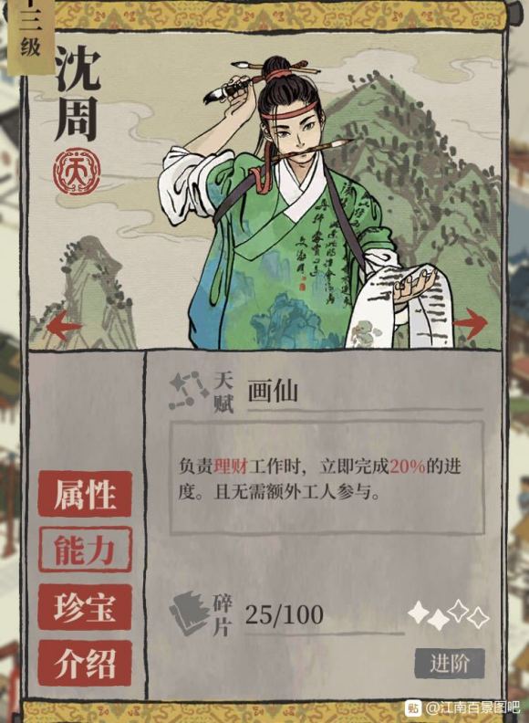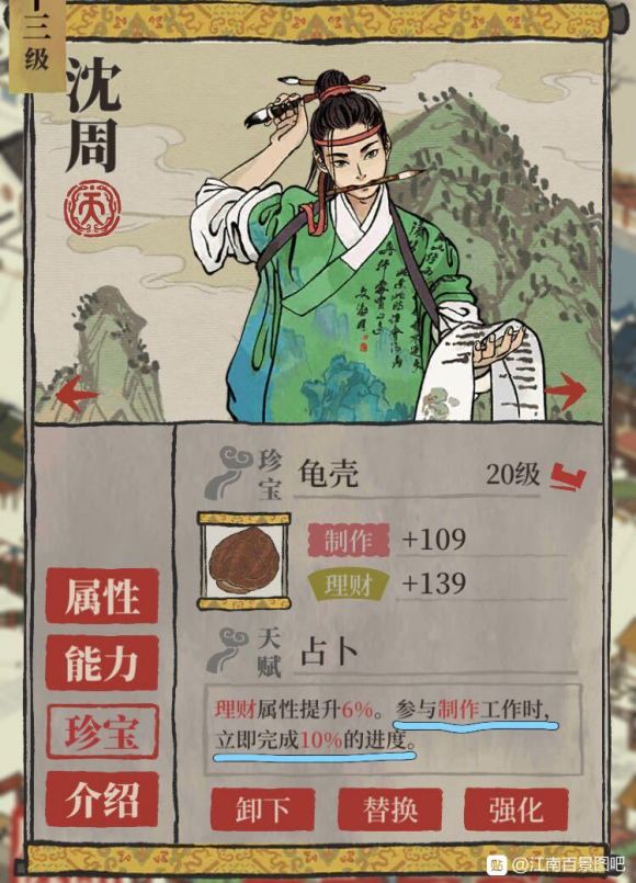 有吧友问沈周 那么他来啦!也不知道为什么我老喜欢他了 呜呜呜老色p了我 沈周是理财的大佬 他还有个神器王八壳子 没有王八壳子的他和有王八壳子的他 完全是两个人 之前不是说过沈周配龟壳有特殊效果吗 这是20级龟壳的效果 加起来就是减少30%的制作时间 理财值高达700+!所以得出结论 龟壳才是沈周的本体