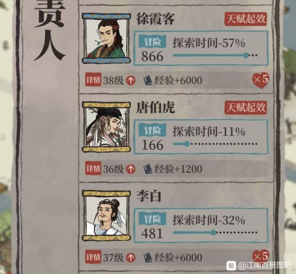 我才知道原来开地经验那么多 这个好像是根据人物属性级别计算的经验 徐霞客李白特级冒险就加6k 唐伯虎中级冒险就加1.2k 大家不要浪费呀 最好是给有特级冒险属性的主力 还发现了一个好玩的 懂的都懂 老友网www.andlaou.com免费为你分享