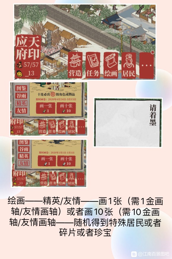 江南百景图特殊居民和珍宝怎么得? 参考答案: 绘画——精英/友情——画1张(需1金画轴/友情画轴)或者画10张(需10金画轴/友情画轴——随机得到特殊居民或者碎片或者珍宝。 老友网www.andlaou.com免费为你分享