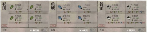 这也需要生产食物的两个原材料能跟上餐馆的进度,农田和鱼塘,自行考虑是否升满级。