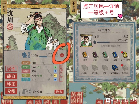 点开居民——详情——经验+号——选择书籍就可以了(书籍可以在书局里得到/杂货摊里也可以用友情点兑换)