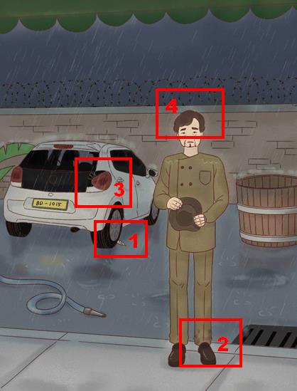 依次点击提交轮胎下面的羽毛、男人右脚裤腿、车右边的尾灯、男人的头发。