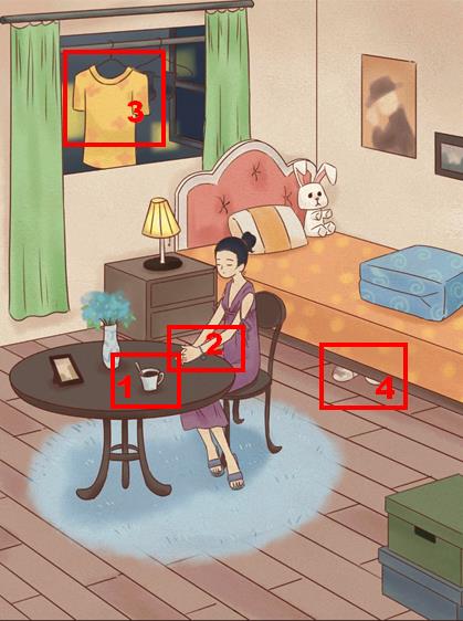 依次点击提交桌上的咖啡、窗外的衣服、女人的手、床底染血的鞋子。