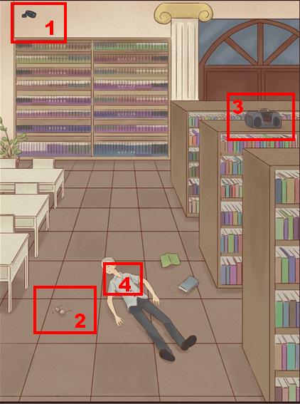 依次点击提交左上角的监控、地上的眼镜、右边书架上的录音机、死者的衣领。