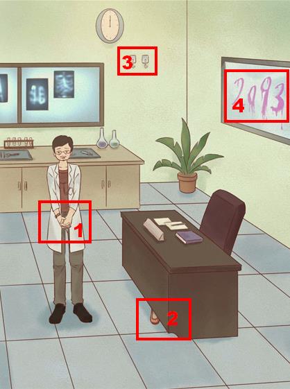 依次点击提交男人的手、办公桌下的鞋、墙上的挂钩、右边的【2093】。