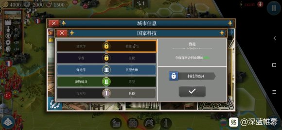 在前30回合把土耳其法国还有英国的主力部队全部歼灭。这个时候你应该也不剩什么将了。如图所示我就剩了四个将。其实炮将最后一个不剩也可以,但是有个远程还是很重要的。基本上瘟疫和急行军的比例应该在3:1左右。你的科技要是满的话,移动力足够。