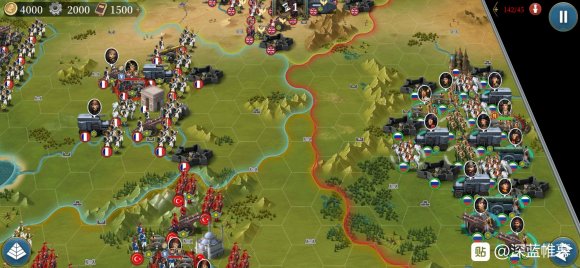 在30到45回合的15回合非常关键,主要考验你的是每个城市的布防,土耳其出的步兵和骑兵比较多,小心马布鲁克避免残血部队送。法国主要是老近卫和野战炮用小部队贴身去打。对于英国的坦克一般都瘟疫,如果强令还活着的话,第一时间用健身把它升级到最高等级,然后利用寺庙回血,我这四个将领分别带了两个救护车,一个帐篷和一个医疗包。