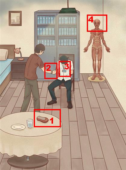 依次点击提交桌上的红鞋、持刀的手、被绑男人的工牌、人体模型的眼睛。