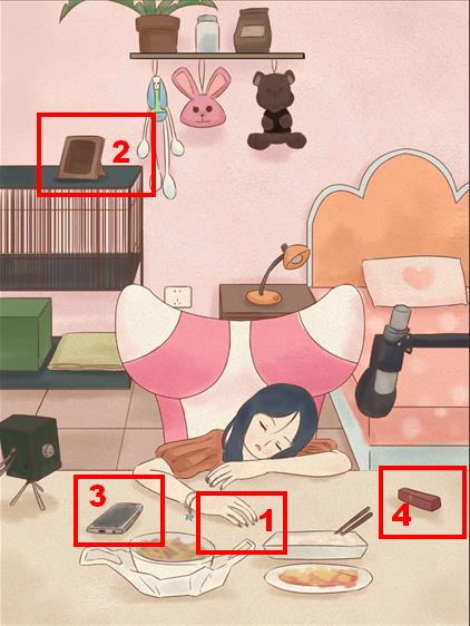 依次点击提交死者左手的指甲、左边笼子上的空相框、死者左边的手机、死者右边的口红。