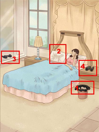 依次点击提交垃圾桶里面的东西、女人旁边的枕头、左边的黑色拖鞋、右边床头柜上的望远镜。