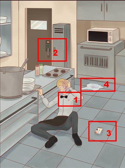 依次点击提交男人衣服上的唇印、门上的密码锁、地上的照片、地上的水渍。