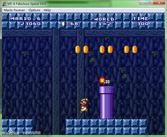 右面水管里貌似有个东西不停地钻来钻去,这是新敌人"水管绿色食人花",本贴简称为"食人花".瞧,它嘴冲上长着,没错吧,食人么食人,当然不能去踩了...