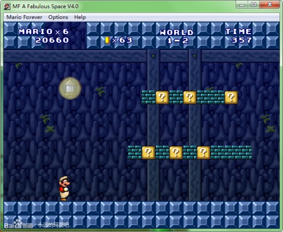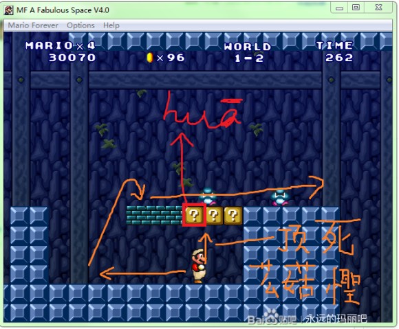 过去了cp,来到了这个地方,发现一行砖块上有2只蘑菇怪,在地上走的怪都可以从砖块或"?"上顶死,像这里(红框中的"?"里面是花),顶完,歹完,按照下图橙色路线逃出此处