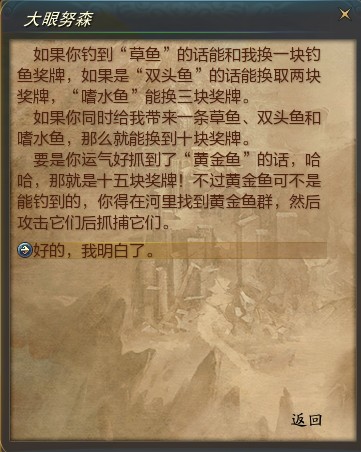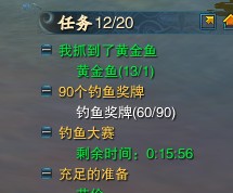 点击NPC会显示让你钓鱼,还给你一根钓竿,但是你千万别傻傻的站在那里钓鱼,因为活动时间每次一小时,接任务后完成时间只有30分钟,钓鱼是不可能掉到250个奖牌的。