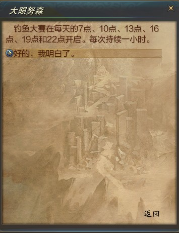 钓鱼大赛,在自由港外面的“大眼努森”处参加,NPC在每天的上午7点,10点,下午的13点,16点,19点和22点才会出现。