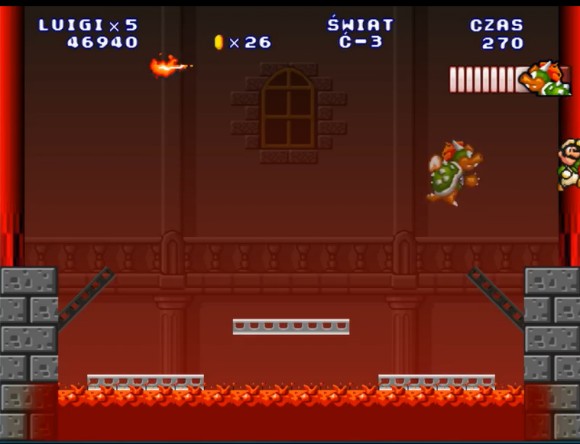 开始库巴战,库巴10血,库巴会飞并且按正弦轨迹移动,如果是一命过来的建议直接踩,因为时间比较紧张。如果在CP后死过,可以放心用火球慢慢磨他的血