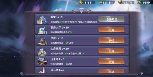 建筑管理可以提升主界面各个建筑的等级,需要不同数量的粮食、木材及石头,不同建筑升级后会有不同的效果。这里优先推荐升满探险小屋,升满后每6个小时能免费获得1张白色藏宝图,香!然后是酒馆,铁匠铺,祭坛和事务大厅。