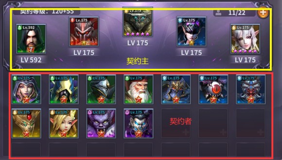 接下来说说等级契约,等级契约分为契约主和契约者,契约主不可手动放入,系统自动选择5名等级最高的英雄把他们塞进去,然后将5名英雄中等级最低一位的等级定为契约等级。但契约者需要手动放入,放入后契约者的等级会自动变成契约等级(注:无法超过契约者当前星级能达到的等级上限,例如契约等级为300级,放入5x契约者后契约者等级会变为150级。另外契约等级是包含进阶的,例如等级最低的怪为120级未进阶,那放入的契约者等级也会是120级未进阶。)