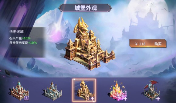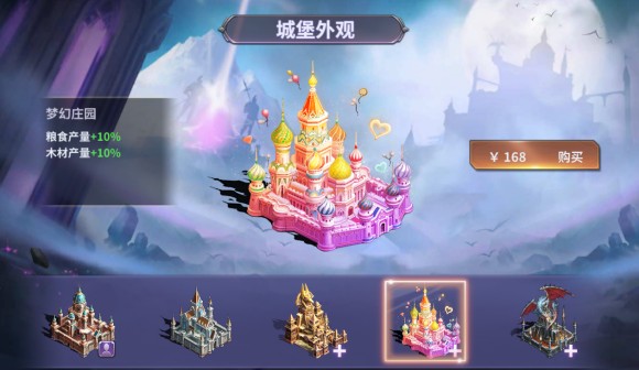 以上分别是4种城堡皮肤的效果以及价格,其中欧风古堡价格为30元,城堡特效可以叠加不用激活。个人建议第一次世界攻城后,如果没开到欧风古堡皮肤的话可以买一个。